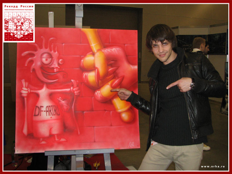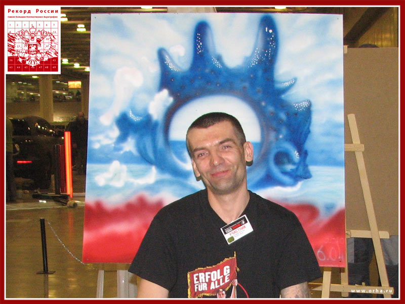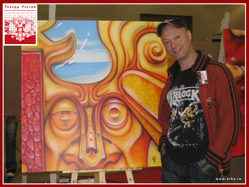 Рекорд России "Самая Большая Коллективная Аэрография" установлен!!!Рекордная планка была задана Объединением Российских Художников Аэрографии (ОРХА). Художники из 15 городов России: Москвы, Санкт Петербурга, Коломны, Владивостока, Барнаула, Подольска, Омска, Волгограда, Орла, Твери, Нижнего Новгорода, Рязани, Протвино, Магнитогорска, Солнечногорска приехали в Москву, чтобы принять участие в акции, нацеленной на установление нового достижения в области современного изобразительного искусства - АЭРОГРАФИИ.