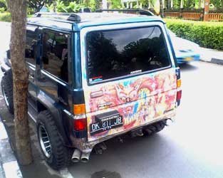 Местные мастера акцентируют свое внимание на автобусах, перевозящих шумных туристов до пляжей, реже встречаются украшенные аэрографическими полотнами частные авто. Качество увиденных рисунков в основном невысокое, возможно все дело в нехватке информации или отсутствии конкуренции. Однако попадались транспортные средства, украшенные умело и очень интересно. К примеру, черный автомобиль японской сборки (фото внизу). Работа выполнена с применением техники Paint Streping и прекрасно гармонирует с мощным характером машины. Обратил внимание на искусную вязь, выполненную на Шевроле (фото слева). Попытки выяснить стоимость работы художника-аэрографиста результатов не дали. Могу лишь предположить, что цена невысока, ведь средняя зарплата на острове составляет $100, а защита от угона на Бали – вряд ли актуальная тема. hudeem.tv