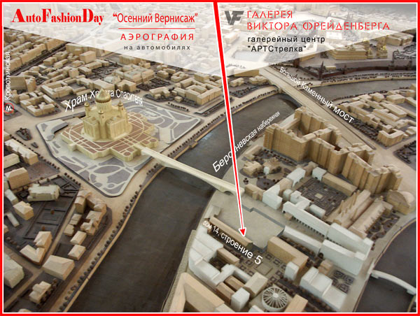 Место проведения вернисажа выбрано не случайно – культурный центр АРТ Стрелка традиционно притягивает наиболее интересные и актуальные события современного искусства. В то же время центр нельзя назвать музеем - это, скорее, творческий полигон, где художественные идеи и концепты обретают живое и непосредственное воплощение. Аэрография, как вид искусства, сегодня является одной из самых популярных новинок в сфере лайф-стайла. Ее поклонники – это успешные и яркие люди, следующие последним тенденциям моды и стиля. Кульминацией вернисажа станет арт-перформанс, режиссером и ведущим которого выступит известный столичный художник и дизайнер Виктор Фрейденберг, а вести мероприятие будет эпатажная Зажигалка. В эффектном шоу публике будут показаны наиболее яркие объекты и скрытые возможности аэрографии. Автомобили выступят в качестве компонентов концептуальной световой инсталляции, демонстрирующей идею эстетической организации пространства. Осенний вернисаж в декорациях центра вечерней Москвы обещает стать уникальным по зрелищности шоу. Официальный страховщик «AUTO FASHION DAY – ОСЕННИЙ ВЕРНИСАЖ» – Первая страховая компания, которая застраховала ответственность организаторов мероприятия. На сегодняшний день Первая страховая является единственной на российском рынке компанией, предлагающей услуги по страхованию художественных рисунков (Аэрографии) на автомобилях и других средствах транспорта. Официальный медиапартнер мероприятия – журнал PLAYBOY. Организатор мероприятия – Объединение Российских Художников Аэрографии (ОРХА). Сбор гостей в 16:00, окончание шоу в 21:00. Адрес: Берсеневская наб., д.14, стр. 5