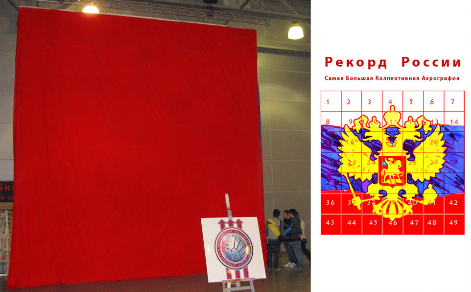 Рекорд России "Самая Большая Коллективная Аэрография" установлен!!!Рекордная планка была задана Объединением Российских Художников Аэрографии (ОРХА). Художники из 15 городов России: Москвы, Санкт Петербурга, Коломны, Владивостока, Барнаула, Подольска, Омска, Волгограда, Орла, Твери, Нижнего Новгорода, Рязани, Протвино, Магнитогорска, Солнечногорска приехали в Москву, чтобы принять участие в акции, нацеленной на установление нового достижения в области современного изобразительного искусства - АЭРОГРАФИИ.